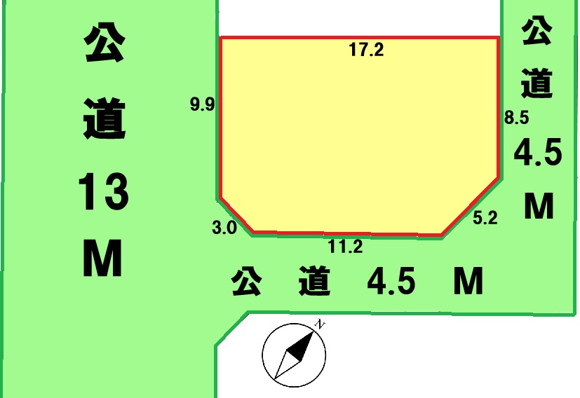 | 接道 | 南東 4.5m(幅員) 公道 11.2m(接面) 南西 13m(幅員) 公道 9.9m(接面) 北東 4.5m(幅員) 公道 8.5m(接面) |