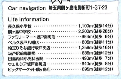 | 学区 | 小学校区:鶴ヶ島市立長久保小学校 1,100m 中学校区:鶴ヶ島市立鶴ヶ島中学校 2,200m |