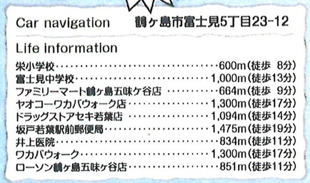 | 学区 | 小学校区:鶴ヶ島市立栄小学校 600m 中学校区:鶴ヶ島市立富士見中学校 1,000m |