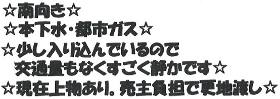 建築条件なし、南道路、公営水道(メーター13mm)、公共本下水、都市ガス、更地渡し