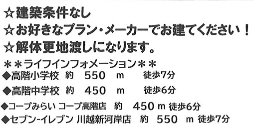 | 学区 | 小学校区:川越市立高階小学校 550m 中学校区:川越市立高階中学校 450m |