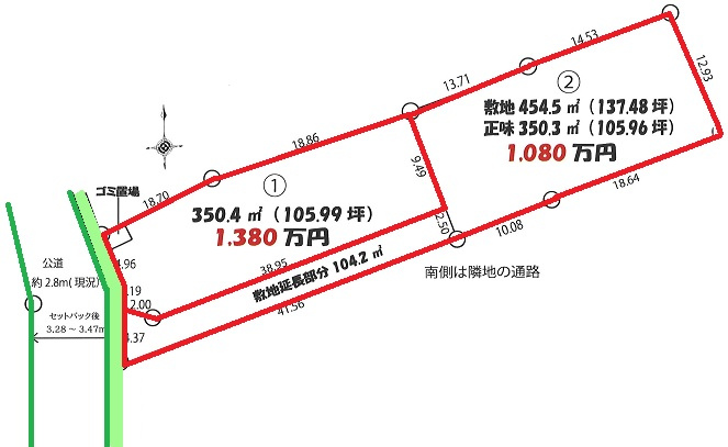 | 接道 | 西 2.8m(幅員) 42条2項道路 4.3m(接面) |
