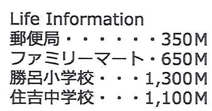 | 学区 | 小学校区:坂戸市立勝呂小学校 1,300m 中学校区:坂戸市立住吉中学校 1,100m |