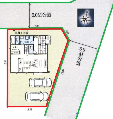 | 接道 | 南東 6m(幅員) 公道 13.8m(接面) 北西 5m(幅員) 公道 10.8m(接面) |