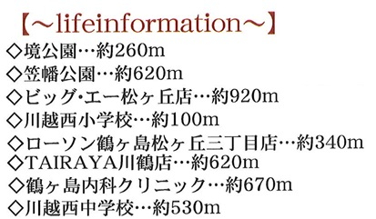 | 学区 | 小学校区:川越市立川越西小学校 100m 中学校区:川越市立川越西中学校 530m |
