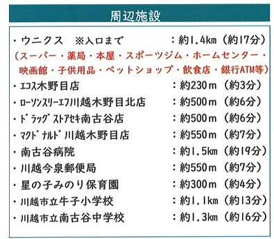 | 学区 | 小学校区:川越市立牛子小学校 1,100m 中学校区:川越市立南古谷中学校 1,300m |