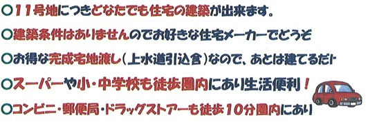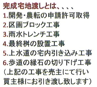 建築条件なし、調整34条11号、公営水道、個別浄化槽、側溝、プロパンガス、農地転用・開発許可が必要です(売主負担)、完成宅地での引渡し