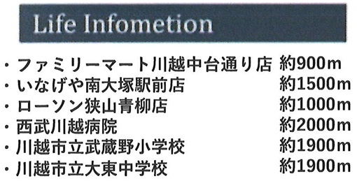 | 学区 | 小学校区:川越市立武蔵野小学校 1,900m 中学校区:川越市立大東中学校 1,900m |