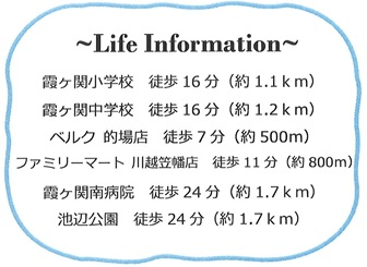 | 学区 | 小学校区:川越市立霞ヶ関小学校 1,100m 中学校区:川越市立霞ヶ関中学校 1,200m |