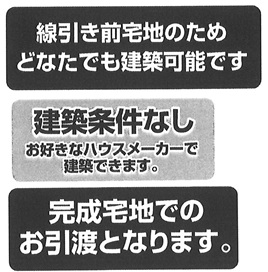 建築条件なし、調整(線引き前宅地)、公営水道、個別浄化槽、都市ガス、開発許可が必要です(売主負担)、完成宅地での引渡し