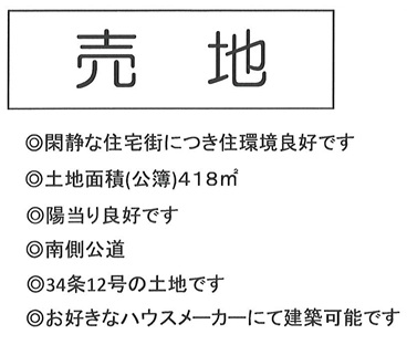建築条件なし、調整34条12号、南道路、公営水道、個別浄化槽、プロパンガス、セットバック要、現況渡し、農地転用・開発許可が必要です(買主負担)