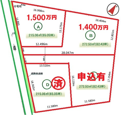 建築条件なし、調整34条12号、公営水道、公共本下水(分担金は買主負担)、都市ガス、農地転用・開発許可が必要です(売主負担)、完成宅地の引渡し