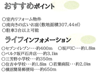 | 学区 | 小学校区:坂戸市立三芳野小学校 350m 中学校区:坂戸市立住吉中学校 1,800m |