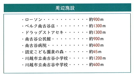 | 学区 | 小学校区:川越市立南古谷小学校 1,200m 中学校区:川越市立南古谷中学校 400m |