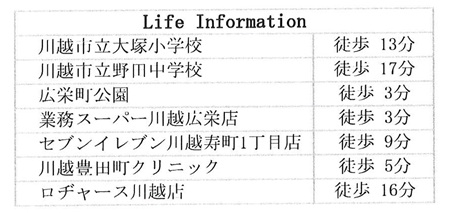 | 学区 | 小学校区:川越市立大塚小学校 900m 中学校区:川越市立大東中学校 1,400m |