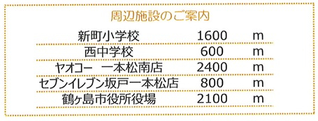 | 学区 | 小学校区:鶴ヶ島市立新町小学校 1,600m 中学校区:鶴ヶ島市立西中学校 600m |