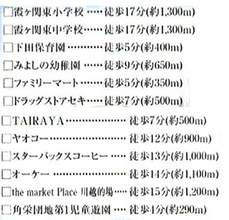 | 学区 | 小学校区:川越市立霞ヶ関東小学校 1,300m 中学校区:川越市立霞ヶ関東中学校 1,300m |