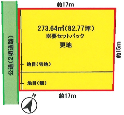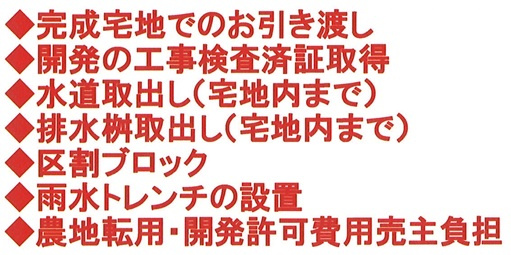 建築条件なし、調整34条12号、公営水道、個別浄化槽(排水先組合承諾要)、プロパンガス、農地転用・開発許可が必要です、完成宅地での引渡し