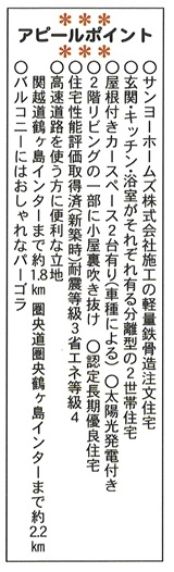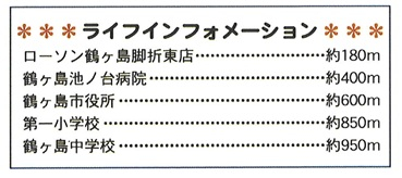 | 学区 | 小学校区:鶴ヶ島市立鶴ヶ島第一小学校 850m 中学校区:鶴ヶ島市立鶴ヶ島中学校 950m |