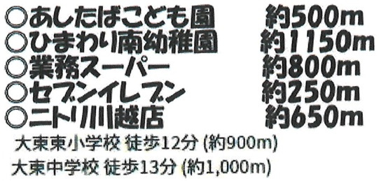 | 学区 | 小学校区:川越市立大東東小学校 900m 中学校区:川越市立大東中学校 1,000m |