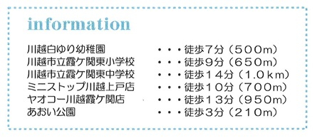 | 学区 | 小学校区:川越市立上戸小学校 1,100m 中学校区:川越市立鯨井中学校 1,400m |