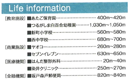 | 学区 | 小学校区:鶴ヶ島市立新町小学校 580m 中学校区:鶴ヶ島市立西中学校 700m |